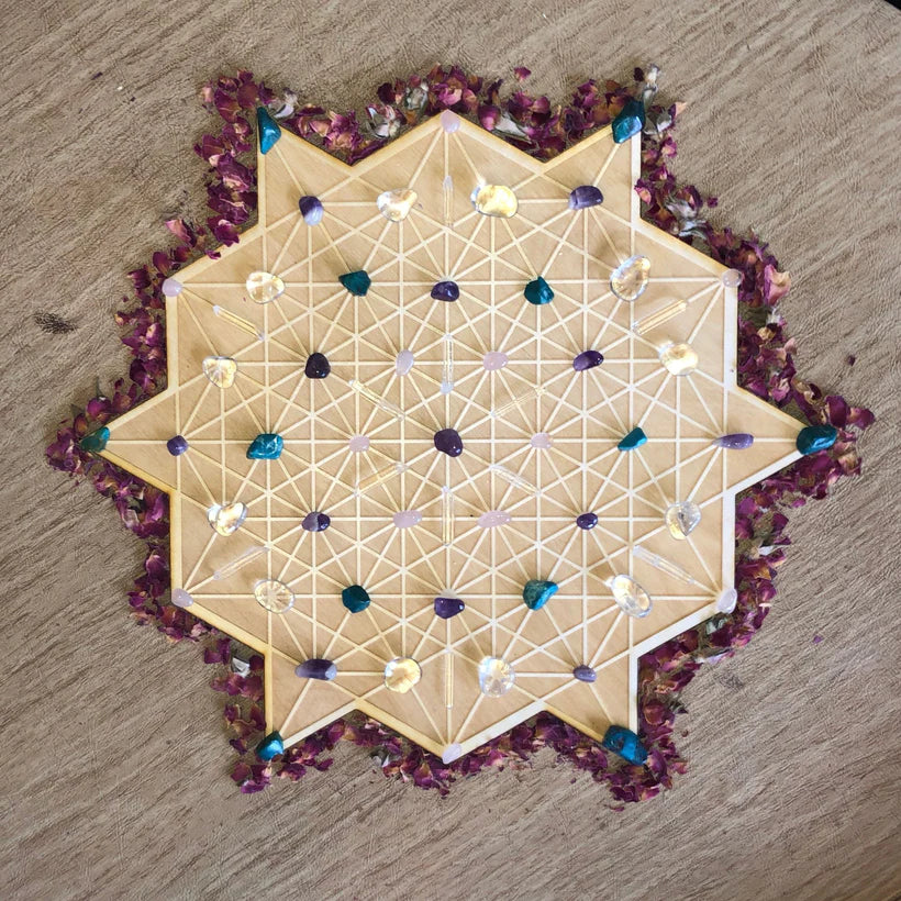 This is a 64 Grid Tetrahedron (8 star tetrahedron) crystal grid made out of Birch wood. These are made to order, you can choose between approximately 4, 6, 8, 10, 12 inches in diameter and 4mm thick. This is just for the grid, stones much be purchased separately.